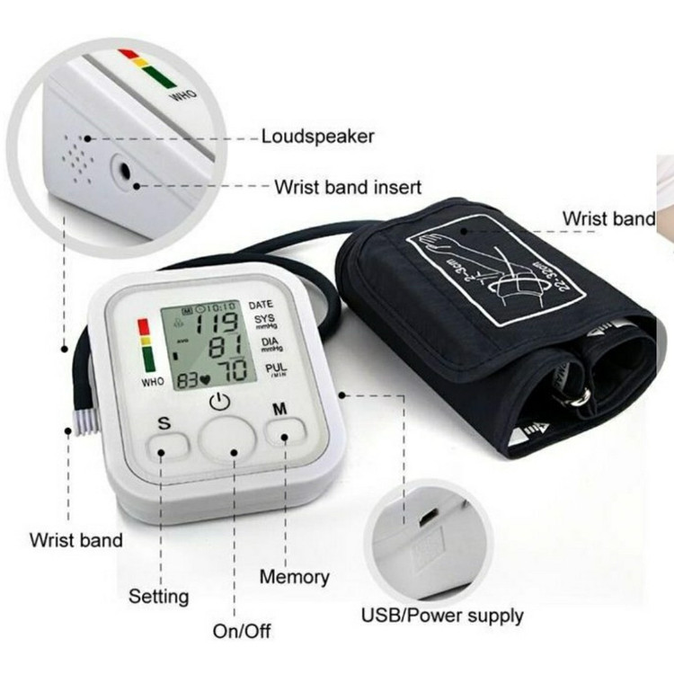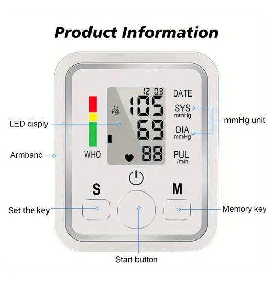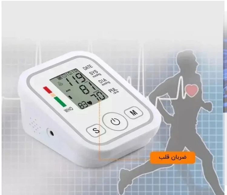 این دستگاه به منظور اندازه گیری فشار خون و ضربان قلب استفاده می شود و فشار خون سیستولیک و دیاستولیک را به نمایش می گذارد. ویژگی های دستگاه: - اندازه گیری خودکار فشار خون و ضربان قلب - صفحه نمایش LCD بزرگ - حافظه برای 99 اندازه گیری - نشانگر سطح فشار خون - خاموشی خودکار - این دستگاه یک ابزار دقیق و قابل اعتماد برای اندازه گیری فشار خون و کنترل روزانه در خانه می باشد که استفاده از آن بسیارآسان است. نکات قابل توجه برای استفاده از فشارسنج دیجیتال Arm Style: - قبل از استفاده، دستورالعمل های دستگاه را با دقت مطالعه کنید. - دستگاه را روی سطح صاف قرار دهید. - بازوبند را روی بازوی خود قرار داده و از محکم بودن آن اطمینان حاصل نمایید. - با فشردن دکمه شروع اندازه گیری آغاز می شود. - پس از اتمام اندازه گیری، دستگاه فشار خون سیستولیک و دیاستولیک و همچنین ضربان قلب را نمایش می دهد.