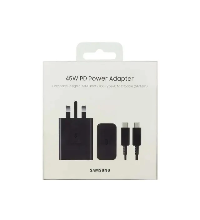 شارژر اصلی سامسونگ سوپر فست 45 وات مدل Travel Adapter Super Fast 45W Type-C -) شارژر 100 درصد اصلی و اورجینال سامسونگ میباشد. این محصول ساخت ویتنام میباشد. شارژر دیواری فوق محصول شرکت سامسونگ است. این شارژر دیواری دارای فناوری PD 3.0 است که با استفاده از آن می توانید دستگاه خود را با سرعت بیشتر و با توان 45 وات شارژ کنید. شدت جریان خروجی این شارژر برابر با 5 آمپر است که می توان از آن برای شارژ کردن تبلت هم استفاده کنید. برای این شارژر از چیپ هوشمندی استفاده شده تا با اتصال دستگاه به صورت خودکار جریان مناسب را برای دستگاه تامین کند. درگاه خروجی این محصول هم از نوع USB-C است. البته همراه با این شارژر یک کابل تبدیل USB-C به USB-C هم ارائه میشود. این شارژر سایر محصولات و موبایل های سری 2019 به بالا و گوشی هایی که توانایی شارژ سوپرفست را دارند پشتیبانی می کند.