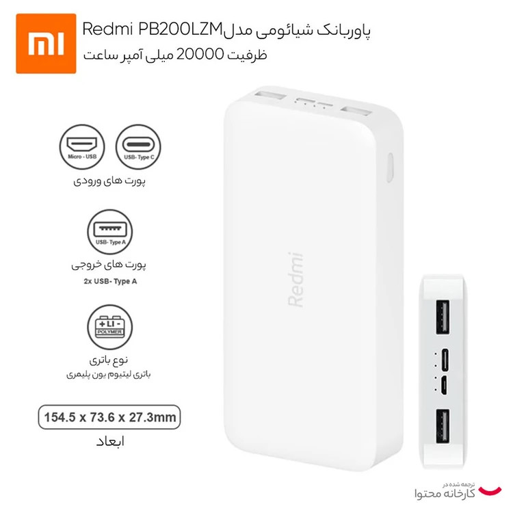 پاور بانک 20000 Redmi مدل PB200LZM ساخت شرکت شیائومی (xiaomi) است. این پاور بانک یک وسیله جانبی پرکاربرد است که نگرانی تمام شدن باتری گوشیهای هوشمند را از بین برده است. این دستگاه توانایی 4.8 مرتبه شارژ Iphone XS را دارد. Redmi 20000 با داشتن دوپورت خروجی USB و پشتیبانی از انواع پروتکلهای شارژ سریع، بهترین همراه شما در خارج از منزل، محل کار و یا هنگام سفر خواهد بود. این محصول با استفاده از سیستم شارژ هوشمند به راحتی میتواند به طور همزمان دو دیوایس شما را شارژ کند، شارژ هوشمند ورودی مناسب را برای هر دیوایس در نظر خواهد گرفت. این محصول با ابعاد 7 × 15 سانتیمتر سبک، راحت و قابلحمل است و به راحتی میتوانید انواع دیوایسهای خود مانند گوشیهای هوشمند، دوربین، تبلت و غیره را در طول روز شارژ کنید. پاور بانک همراه شیائومی دارای سیستم محافظت در برابر مشکلاتی مانند نوسانات برق، اتصال کوتاه، تغییرات دما، اضافه جریان در ورودی و خروجی و غیره است. این پاور بانک از پورت خروجی دوگانه USB_A و پورت ورودی دوگانه USB-C و MicroUSB برخوردار است. همچنین حداکثر میزان قدرت برای پورت ورودی 5V _2.1A و پورت خروجی آن 5.1V_3.6A است. این دستگاه دارای دو درگاه ورودی MicroUSB - TypeC برای شارژ است و قابلیت سازگاری با تمامی گجت های هوشمند شما را دارد. در مجموع این پاور بانک با توانایی چندین بار شارژ گوشیهای هوشمند، میتواند یک انتخاب مناسب برای استفاده روزمره باشد.