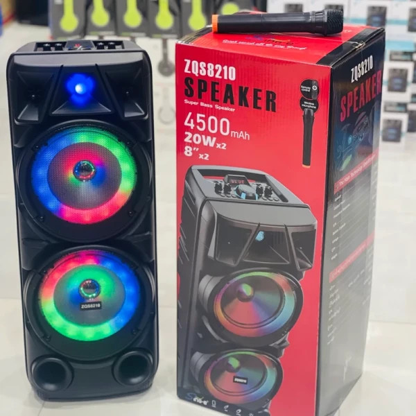 پس از سالها تجربه و تولید محصولات مختلف اینبار شاهد شاهکار بی نظیر شرکت ZQS مدل معروف ZQS 8210 هستیم.این اسپیکر در سال 2022 به عنوان پر فروش ترین محصول این شرکت در کشور ایران برگزیده شد.8210 یک اسپیکر با دو بلندگوی 8 اینچی و یک تیوتر یک اینچی میباشد که قادر به صدایی بسیار بلند و با کیفیت با حجم 4000 هزار وات اسمی می باشد.طراحی ظاهری این اسپیکر بسیار زیبا و ارگونمی می باشد که به راحتی قابلیت حمل و جابجایی را دارد.باتری درون این اسپیکر از ظرفیت بسیار بالای 4500 میلی آمپر برخوردار است که توانایی روشن نگه داشتن این اسپیکر را به مدت حداکثر 6 ساعت دارد.در قسمت فوقانی این محصول پنل کنترل کننده بسیار حرفه ای دیده می شود.همچنین در قسمت پشتی این محصول جایگاهی تعبیه شده که میتوانید با قرار دادن میکروفن بیسیم در آن از گم شدن یا اسیب دیدن میکروفن جلوگیری کنید.یر روی میکروفن این محصول کلید های کم و زیاد کردن و تغییر صدای خواننده(بچه/زن/ پیر مرد) وجود دارد.رقص نور این محصول نیز دارای قابلیت تغییر و خاموش کردن می باشد.در کل 8210 یکی از بهترین گزینه ها ی خرید برای انتخاب یک اسپیکر برای داخل و خارج از منزل می باشد.