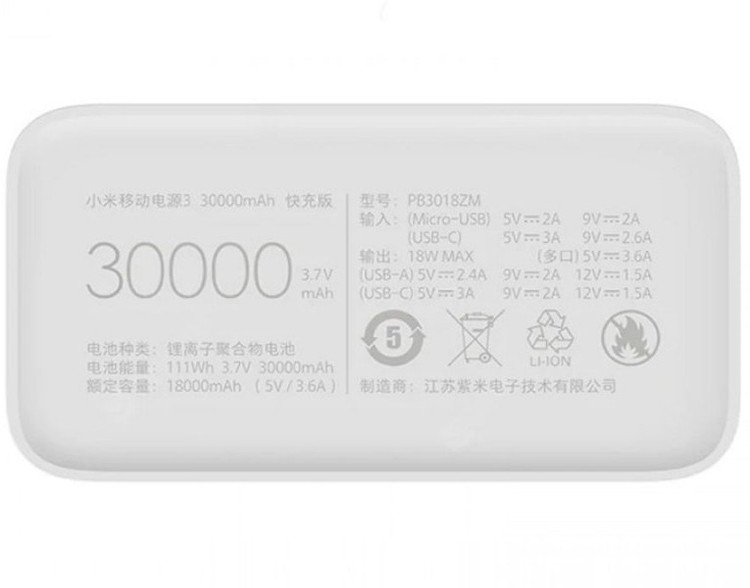 پاوربانک شیائومی ظرفیت 30000 میلی آمپر مدل Mi Power Bank 3 30000mAh PB3018ZM پاوربانک خود با ظرفیت 30000 میلی آمپر را عرضه کرده است. این بزرگترین پاوربانک شیائومی است. جنس این پاوربانک از پلاستیک PC+ABS که با محیط زیست سازگار است میباشد. جلای مات دارد. قابلیت شارژ سریع دو طرفه مهمترین ویژگی شیائومی می پاوربانک 3 PB3018ZM است پس علاوه بر آن که سریع شارژ میشود سریع هم دستگاه متصل شده را شارژ میکند. ظرفیت این پاوربانک به اندازهای است که میتواند یک گوشی مانند Mi 10 شیائومی (4،780 میلیآمپر ساعت) را 4.5 بار یا باتری کوچکتر از آن مانند آیفون SE جدید را (1،821 میلیآمپر ساعت) بیش از 10 بار شارژ کند.