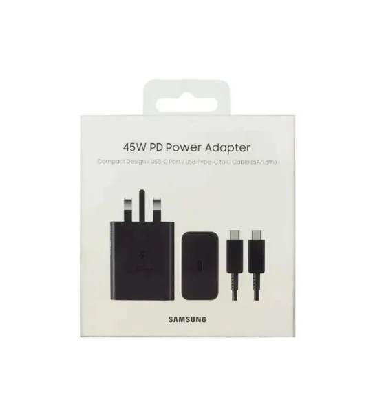 شارژر اصلی سامسونگ سوپر فست 45 وات مدل Travel Adapter Super Fast 45W Type-C (EP-T4510) شارژر 100 درصد اصلی و اورجینال سامسونگ میباشد. این محصول ساخت ویتنام میباشد. این شارژر دیواری دارای فناوری PD 3.0 است که با استفاده از آن می توانید دستگاه خود را با سرعت بیشتر و با توان 45 وات شارژ کنید. شدت جریان خروجی این شارژر برابر با 5 آمپر است که می توان از آن برای شارژ کردن تبلت هم استفاده کنید. برای این شارژر از چیپ هوشمندی استفاده شده تا با اتصال دستگاه به صورت خودکار جریان مناسب را برای دستگاه تامین کند. درگاه خروجی این محصول هم از نوع USB-C است. البته همراه با این شارژر یک کابل تبدیل USB-C به USBc هم ارائه میشود. این شارژر سایر محصولات و موبایل های سری 2019 به بالا و گوشی هایی که توانایی شارژ سوپرفست را دارند پشتیبانی می کند.