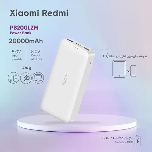 پاور بانک 20000 Redmi مدل PB200LZM ساخت شرکت شیائومی (xiaomi) است. این پاور بانک یک وسیله جانبی پرکاربرد است که نگرانی تمام شدن باتری گوشیهای هوشمند را از بین برده است. این دستگاه توانایی 4.8 مرتبه شارژ Iphone XS را دارد. Redmi 20000 با داشتن دوپورت خروجی USB و پشتیبانی از انواع پروتکلهای شارژ سریع، بهترین همراه شما در خارج از منزل، محل کار و یا هنگام سفر خواهد بود. این محصول با استفاده از سیستم شارژ هوشمند به راحتی میتواند به طور همزمان دو دیوایس شما را شارژ کند، شارژ هوشمند ورودی مناسب را برای هر دیوایس در نظر خواهد گرفت. این محصول با ابعاد 7 × 15 سانتیمتر سبک، راحت و قابلحمل است و به راحتی میتوانید انواع دیوایسهای خود مانند گوشیهای هوشمند، دوربین، تبلت و غیره را در طول روز شارژ کنید. پاور بانک همراه شیائومی دارای سیستم محافظت در برابر مشکلاتی مانند نوسانات برق، اتصال کوتاه، تغییرات دما، اضافه جریان در ورودی و خروجی و غیره است. این پاور بانک از پورت خروجی دوگانه USB_A و پورت ورودی دوگانه USB-C و MicroUSB برخوردار است. همچنین حداکثر میزان قدرت برای پورت ورودی 5V _2.1A و پورت خروجی آن 5.1V_3.6A است. این دستگاه دارای دو درگاه ورودی MicroUSB - TypeC برای شارژ است و قابلیت سازگاری با تمامی گجت های هوشمند شما را دارد. در مجموع این پاور بانک با توانایی چندین بار شارژ گوشیهای هوشمند، میتواند یک انتخاب مناسب برای استفاده روزمره باشد.